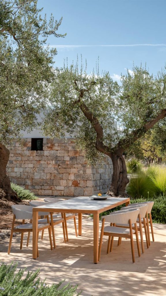 Tables, tables basses, consoles, ombrages, du mobilier de jardin en bois exotiques et durables, des matières et tissus de haute résistance conçus pour l’extérieur.